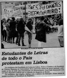 No dia 13 de março de 1987, os estudantes fizeram uma manifestação junto ao Ministério. O ministro não está? então toca de ir até ao Rossio. E fomos. Assim, sem nada marcado. Imagine-se a confusão de trânsito causada por centenas de estudantes a desfilar, num dia de semana, entre a 5 de Outubro e o Rossio. Os automobilistas acenavam e aplaudiam (alguns, pelo menos). A polícia? Ohh eram outros tempos, barravam as ruas para nos deixar passar. Chegados ao Rossio, acabou a festa. Estava lá o corpo de intervenção à nossa espera. Sentámo-nos, fizemos uma última prova da nossa indignação e fomos todos para casa. Não houve incidentes. No noticiário da noite não passou nada. Os boicotes da RTP não eram fachada, eram mesmo verdade. Não havia redes sociais, internet, telemóveis. O país não soube de nada. Nem sequer como, nesse dia, os estudantes paralisaram meia Lisboa de improviso, sem confrontos nem cargas policiais. Estranho dia, esse. Na manhã seguinte, um único jornal dava conta do que ocorrera. O Diário, pois claro. Para o resto do país, nada acontecera.