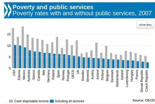 A OCDE procurou medir o impacto dos serviços publicos nas desigualdades de rendimento e as conclusões são muito interessantes. Quando tomados em consideração, os serviços públicos fazem descer a taxa de pobreza dos países da OCDE de 10,2% para 5,5% (uma quebra de 4,7 pontos percentuais), descendo, em Portugal, de 12,7% para 5,8% (uma quebra de 6,9 pontos percentuais), aproximando Portugal da média da OCDE.