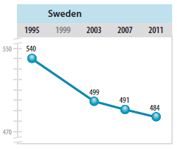 Mais interessante do que isso é tentar perceber como evoluiu nesta década e meia. Nos alunos do 4.º ano isso não é possível, uma vez que a Suécia antes só havia participado no estudo imediatamente anterior, o de 2007 (o resultado foi de 503 pontos). Mas podemos ver essa evolução nos alunos do 8.º ano (os alunos portugueses do 8.º ano não participaram). E é esta: