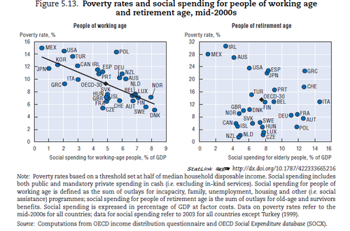 O da esquerda mostra a correlação entre despesa social orientada para a população com idade activa e o risco de pobreza desta população. Como se vê, a correlação positiva é significativa: nos países onde a despesa social é mais elevada, o risco de pobreza tende a ser menor (como sabemos, isto depende não apenas da eficácia e eficiência das prestações sociais, mas também da distribuição primária do rendimento, mas isso é outra discussão).