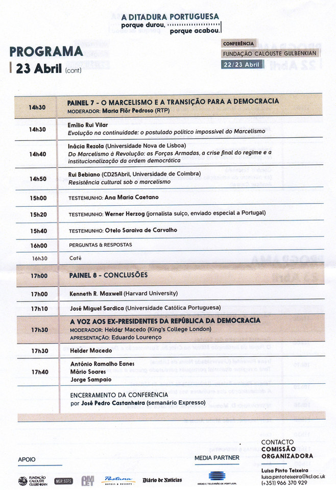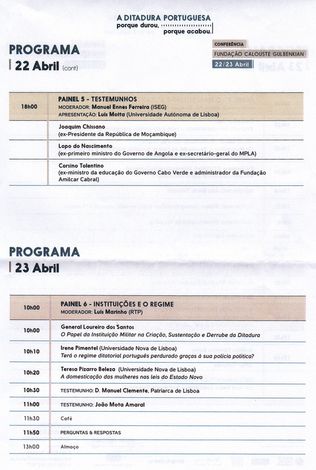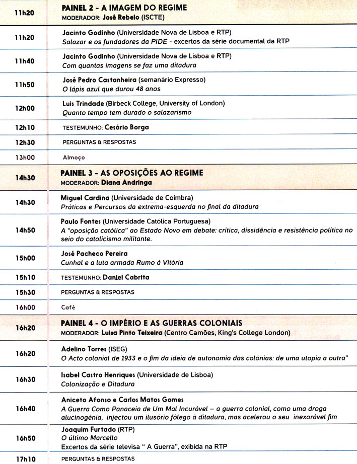 Na conferência “A Ditadura Portuguesa. Porque durou, porque acabou" vai-se debater a caracterização do regime ditatorial e colonial português, o papel das suas instituições, a questão do império colonial e das guerras coloniais, bem como a atuação das diversas oposições ao Estado Novo.