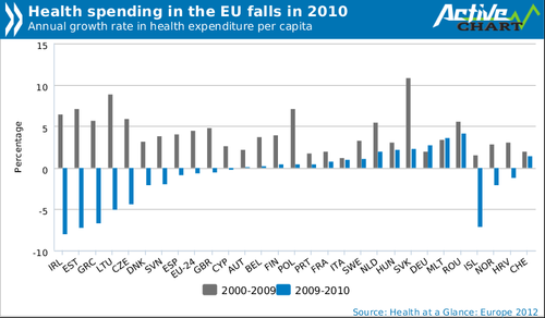 Este gráfico do Health at a Glance 2012, hoje divulgado, é revelador do que se passa na Europa (as barras azuis mostram a variação da despesa em saúde per capita entre 2009 e 2010). Mas também é revelador do mito que por todo o lado corre sobre o crecimento descontrolado da despesa em saúde em Portugal na famosa "década perdida" (2% de crescimento médio anual entre 2000 e 2009).